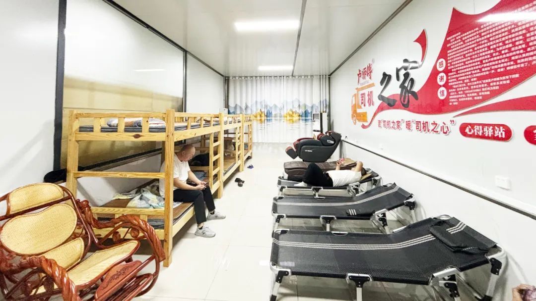 大家首先走进火遍网络的卢师傅“司机之家”,这里属于出货区,停满了来自周边省份的大货车,远的有江苏、上海,近的有来自安徽、山东等地。走进房间,窗明几净,被褥都叠放得整整齐齐,里面还放了一个按摩椅。门口人来人往,有一脸疲惫进来休息的,也有养精蓄锐后精神饱满启程的,手里拿着厂里赠送的水和月饼等食品,一脸笑呵呵。